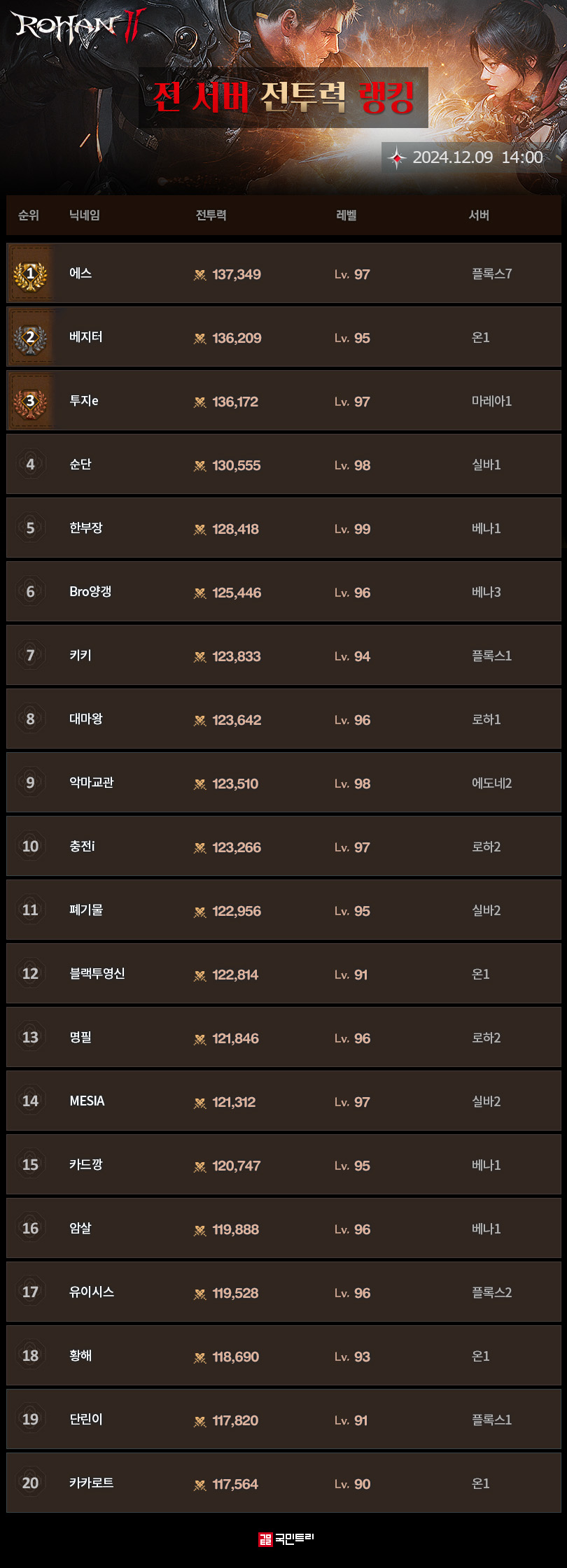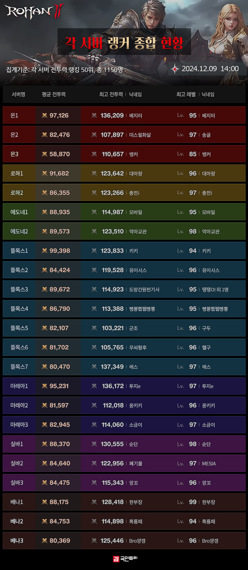 ▲ 로한2 12월 2주차 각 서버 랭커 현황 (자료: 국민트리 제작)