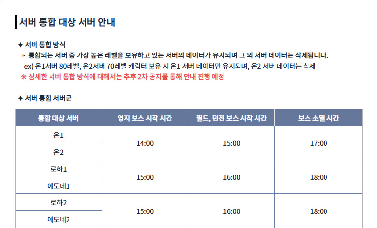 ▲ 통합되는 서버와 콘텐츠 시간대를 꼭 확인 (사진출처: 로한2 공식 커뮤니티)