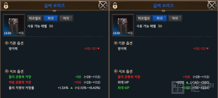 공식 커뮤니티의 한 유저는 50레벨 제한 희귀 등급 하의의 서브 옵션을 놓고 고민 중이었습니다. 물리 관통력 저항 옵션이 붉은색 수준으로 높은 것을 착용 중인데, 물리 관통력 저항은 이보다 낮은 보라색이지만 마법 관통력 저항이 붉은색 수준인 장비를 얻었다는군요. 이에 전자와 후자 중 어느 장비를 착용할지 다른 이들의 의견을 구했습니다.