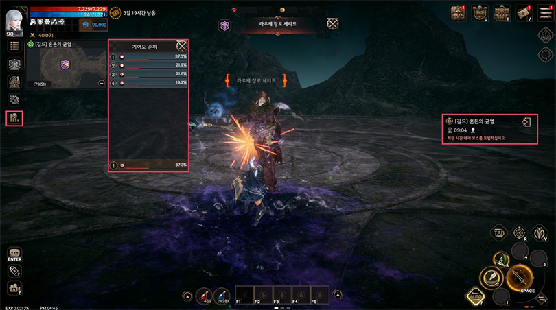 던전에 입장하면 보스가 있는 원형 맵에서 전투가 벌어집니다. 길드 소환 보스는 기존 보스에 비해 체력이 적고, 그 외 능력치와 전투 패턴은 같죠. 제한 시간 10분 안에 보스를 처치하면 클리어합니다. 라우케 장로 세티드, 그롬 나이트, 도미네이트 등 영지 보스를 소환할 수 있으니 길드원들과 함께 토벌에 도전하세요.