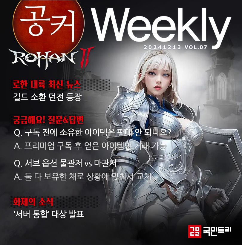 서버 통합 다음으로 관심을 받은 것은 ‘길드 소환 던전’이었습니다. 길드 훈장을 모으면, 길드장이 아이템을 구매해 길드 소환 던전으로 가는 포탈을 열 수 있죠. 이 외에 유저들 사이에서는 프리미엄 구독권과 서브 옵션 질문이 올라왔습니다. 이번 주 커뮤니티 소식을 공커 위클리가 정리했습니다.