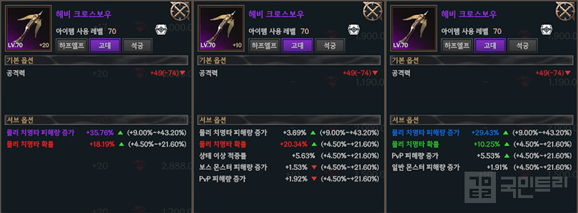 로한2 유저들은 지금 이 순간에도 캐릭터 육성을 위해 노력하고 있죠. 그런데 점차 무기의 레벨 제한과 등급이 오를수록 파밍 난도가 높아지기 마련입니다. 이번 주에도 이와 같은 고민을 하고 있는 유저가 등장해 눈길을 끌었죠. 해당 유저는 현재 갖고 있는 희귀 등급 ‘헤비 크로스보우’를 90레벨까지 사용해도 될지 문의했죠. 해당 장비는 서브 옵션이 일반 몬스터 피해량 증가가 빨간색 수준, PvP 피해량 증가가 파란색으로 붙어있었습니다.