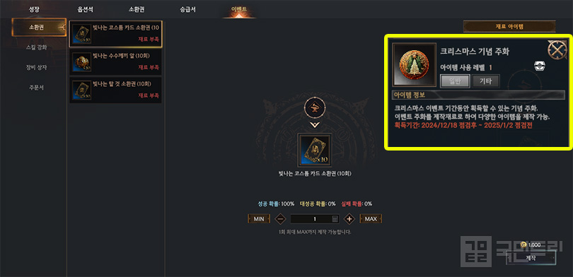 의뢰 이벤트는 2025년 1월 8일까지 개최합니다. 이벤트 기간 동안 의뢰를 완료하면 '크리스마스 기념 주화'를 받을 수 있습니다. 의뢰 난이도에 따라 1~3개의 주화 획득이 가능하죠. 이렇게 모은 주화는 제작에 사용하면 됩니다. 빛나는 소환권, 에이션트 스킬 강화석 등 유용한 아이템으로 만들 수 있군요. 의뢰 퀘스트도 최대한 수행해야겠네요.