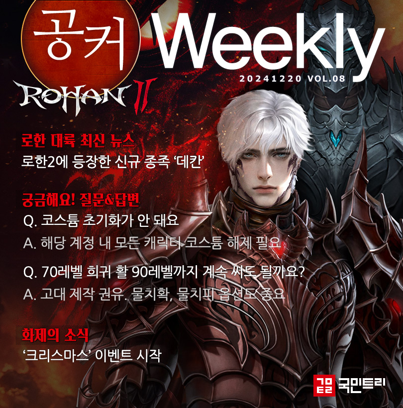 ‘로한2’에 마침내 신규 종족 ‘데칸’이 등장했습니다. 드래곤의 후예이며 전직에 따라 공격이 물리, 마법으로 나뉘는 특징이 있죠. 이에 많은 유저들이 데칸 육성을 시작했습니다. 더불어 크리스마스를 맞아 출석, 의뢰 이벤트가 열려 눈길을 끌었습니다. 유용한 보상을 다수 얻을 수 있으니 적극 참여하세요. 이번 주 커뮤니티 소식을 공커 위클리가 정리했습니다.