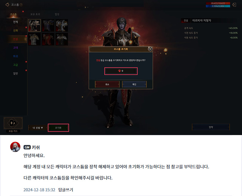 이에 많은 유저들이 코스튬을 초기화하고 데칸 코스튬으로 바꿔 게임을 즐기고 있습니다. 그런데 일부 유저들은 코스튬 초기화가 안 된다며 커뮤니티에 질문을 남기기도 했습니다. 이는 계정 내 캐릭터가 코스튬을 착용하고 있기 때문인 경우가 대부분입니다. 코스튬 초기화를 위해서는 모든 캐릭터가 코스튬을 장착 해제해야 한다는군요. 코스튬 초기화를 진행하려는 유저라면 참고하세요.