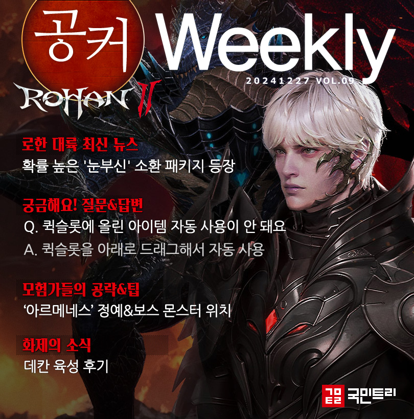 지난 업데이트에서 ‘로한2’에 신규 종족 ‘데칸’이 등장했죠. 그 즉시 많은 유저가 데칸 육성을 시작했습니다. 그리고 공식 커뮤니티에 육성 후기가 속속 올라오고 있죠. 이에 데칸 육성을 고민하던 유저들이 정보를 얻고 있습니다. 더불어 기존보다 확률이 더 높은 눈부신 소환 패키지가 나와 유저들의 시선을 끌었습니다. 이번 주 커뮤니티 소식을 공커 위클리가 정리했습니다.
