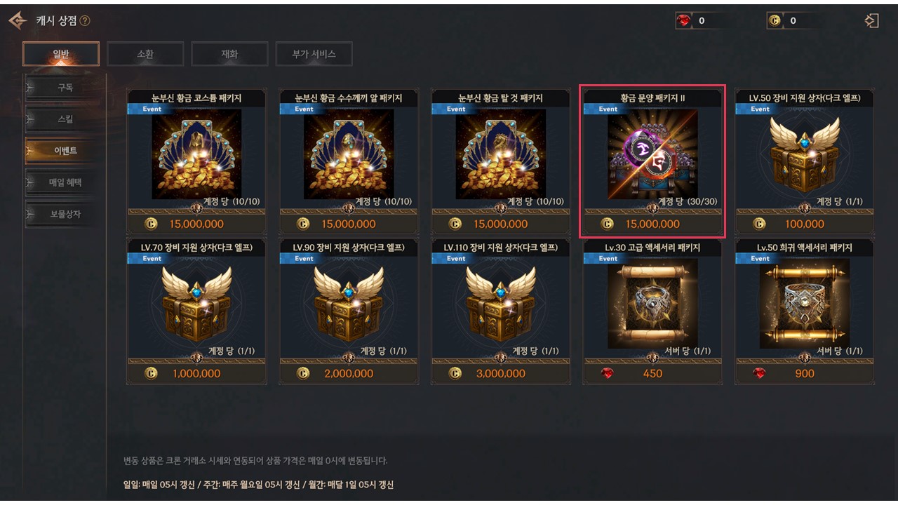 | 황금 문양 패키지 II | 혼돈의 문양강화석 상자 | 50 | 1500만 크론 | 계정당 30회 |