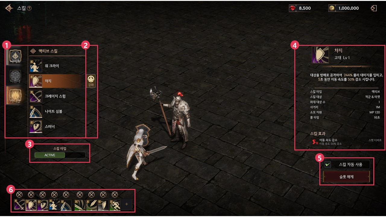 ⑥ 스킬 페이지 / 슬롯별 등록 상태를 확인하거나 슬롯에 등록한 스킬을 등록 해제할 수 있습니다.