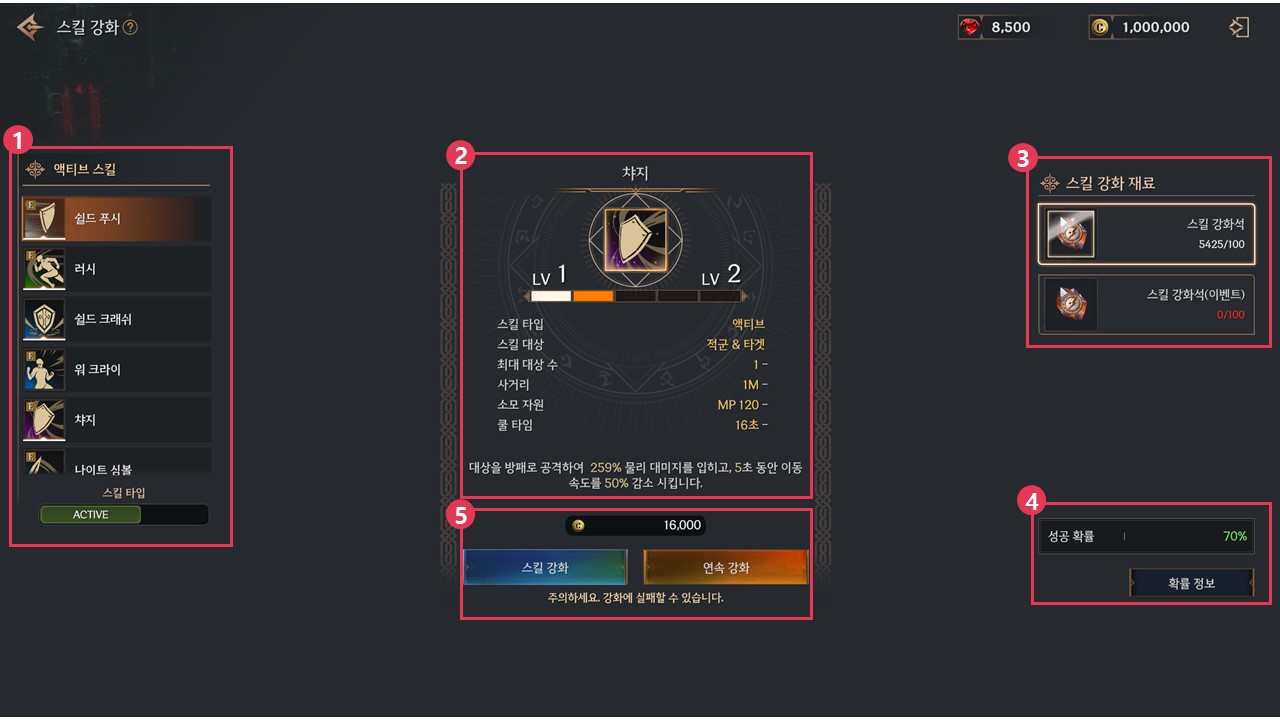 ② 선택한 스킬의 강화 전후 레벨과 강화 성공 시 스킬 정보를 확인할 수 있습니다.