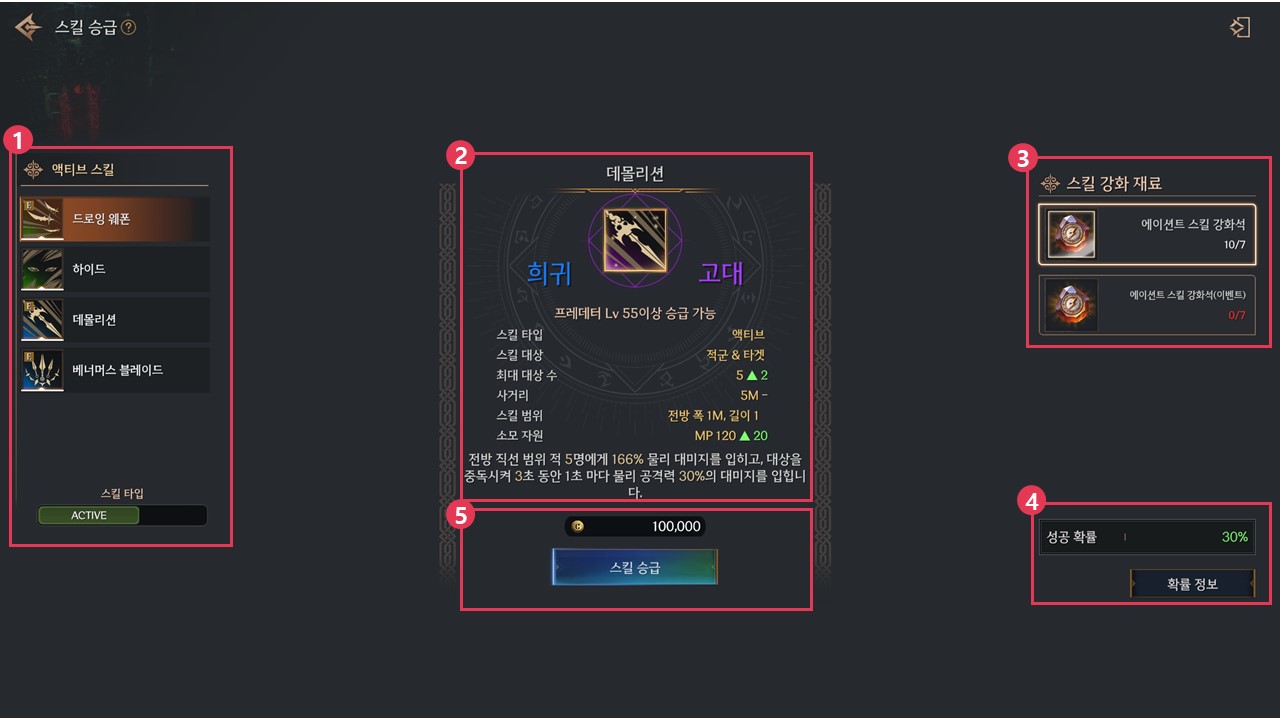 - 승급: 최초 등급에서 최대 강화 단계에 도달한 스킬을 승급할 수 있습니다.
