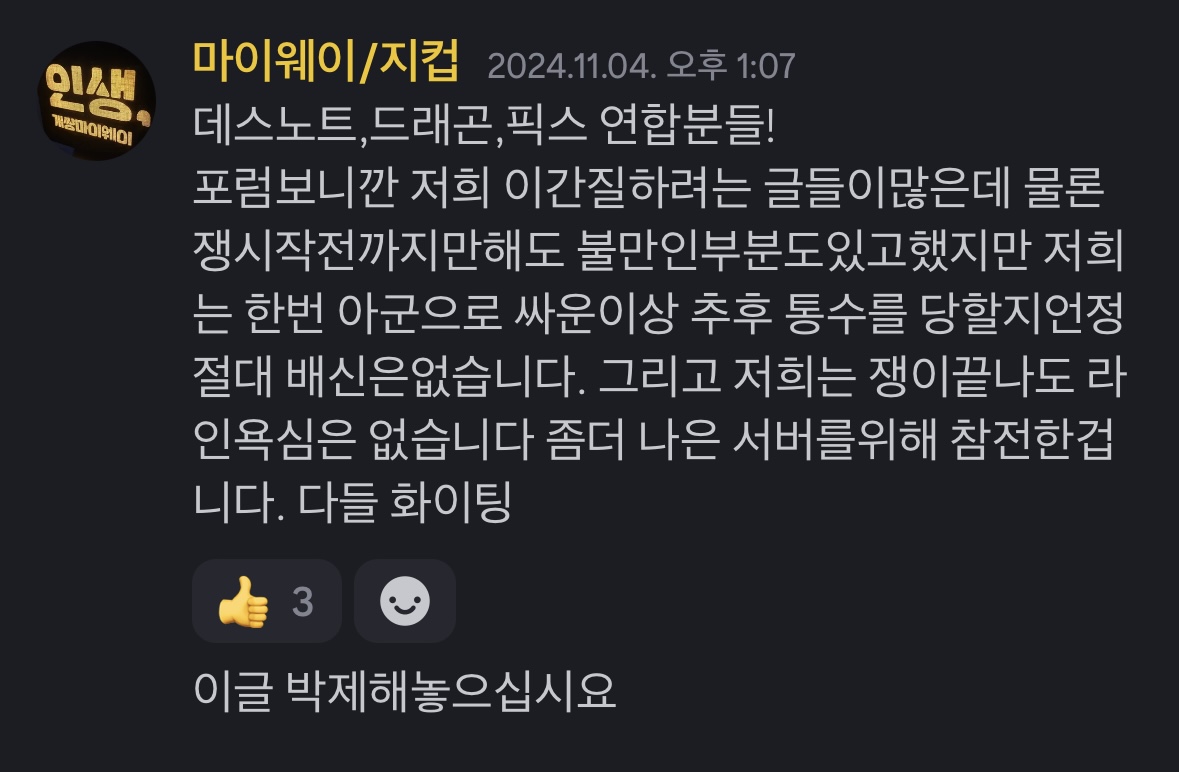 형님들 저희는 악동이랑 쟁하기전부터 이기고나서 연합에서 어떻게처우하던 우리할일끝났으니 욕심안부리겠다 못박아놨습니다 전후 사정모르면 그냥 아1가리 싸물어주십시요 ㅎㅎ속상합니다