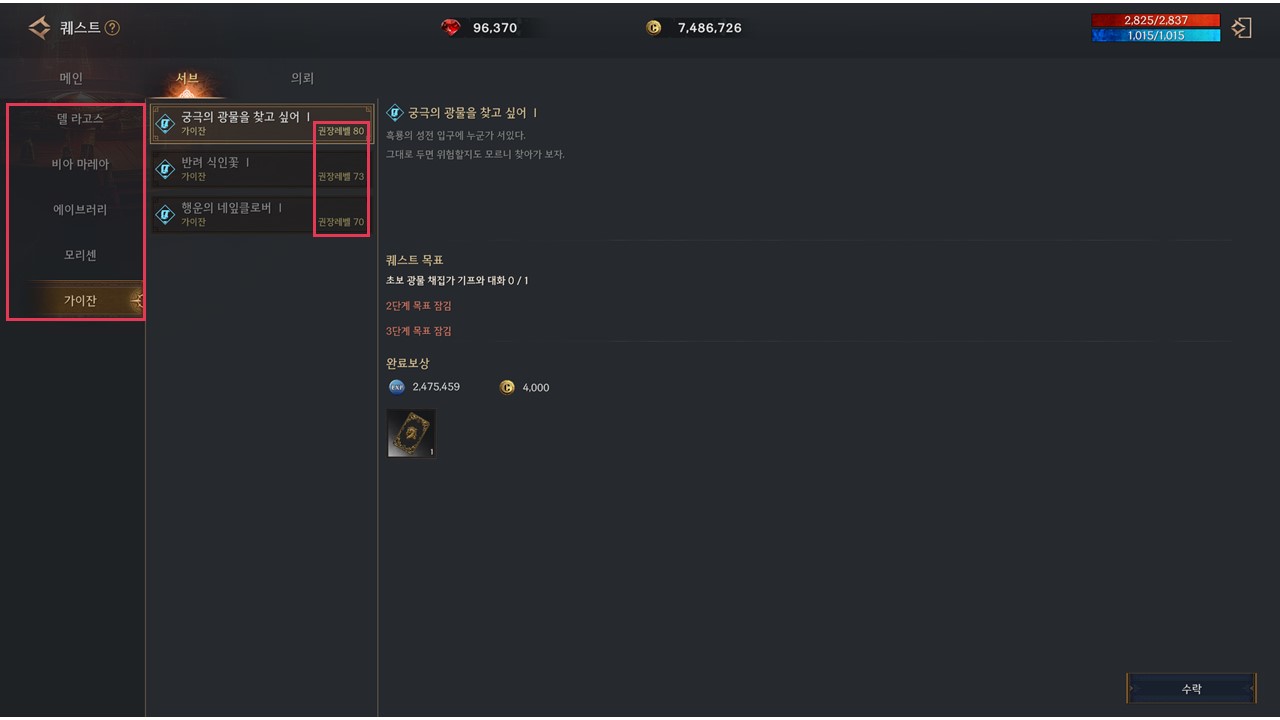 ▹ 메인/서브 퀘스트가 지역별로 구분되고, 서브 퀘스트는 권장 레벨을 확인할 수 있도록 변경됩니다.