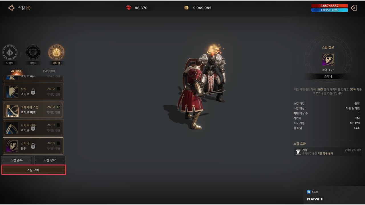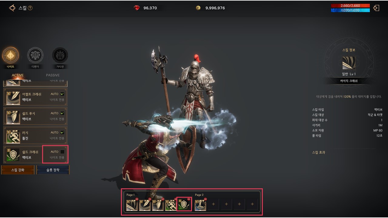 | 나이트 심볼 | 기존 | 검을 올려쳐 대상의 방어력을 무시한채 98% 물리 대미지를 입힙니다. | 14 |
