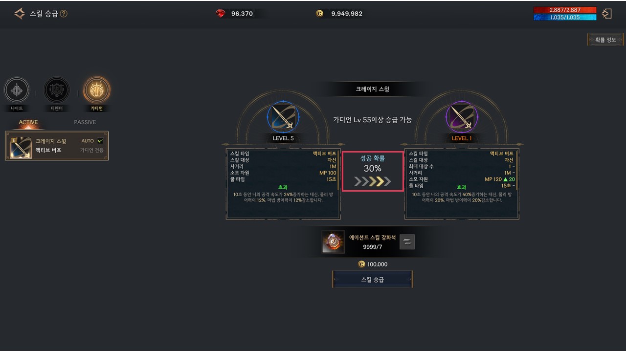 ▹ 스킬 승급 화면에 승급 확률이 표기됩니다.