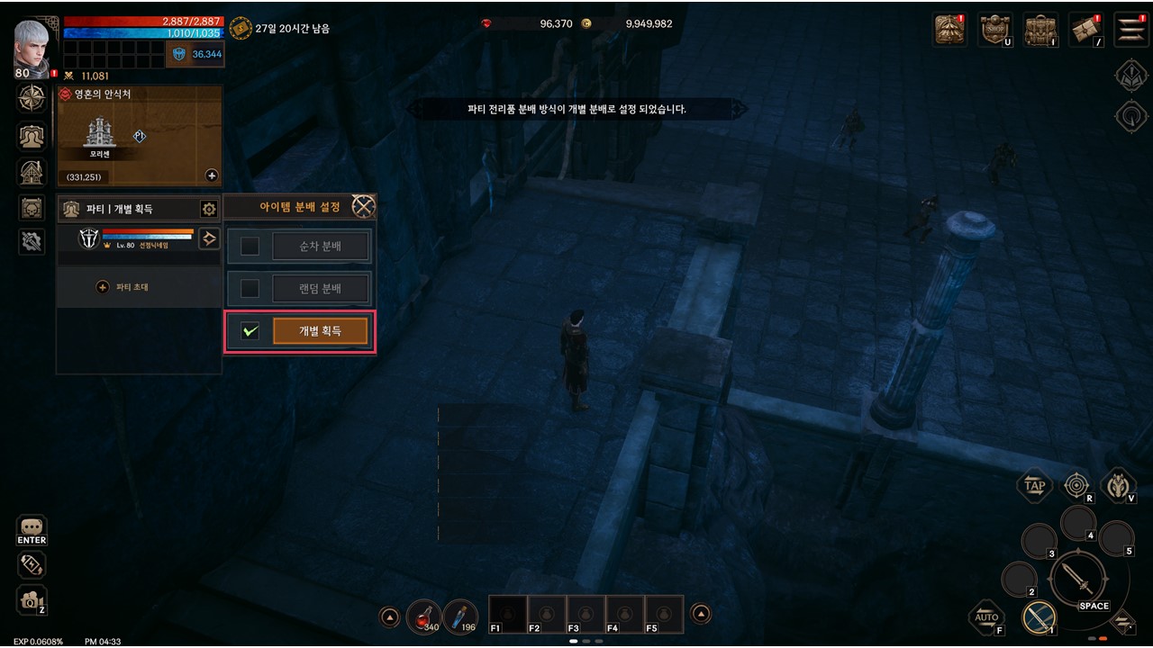 - 개별 획득은 본인이 사냥한 몬스터가 드롭한 아이템은 본인이 획득하는 분배 방식입니다.