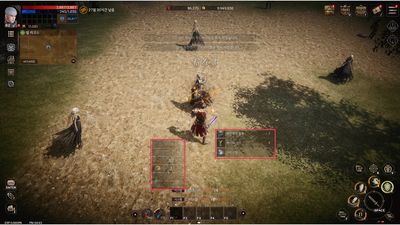 - 중앙 좌측에 획득 경험치/크론이 표시됩니다.