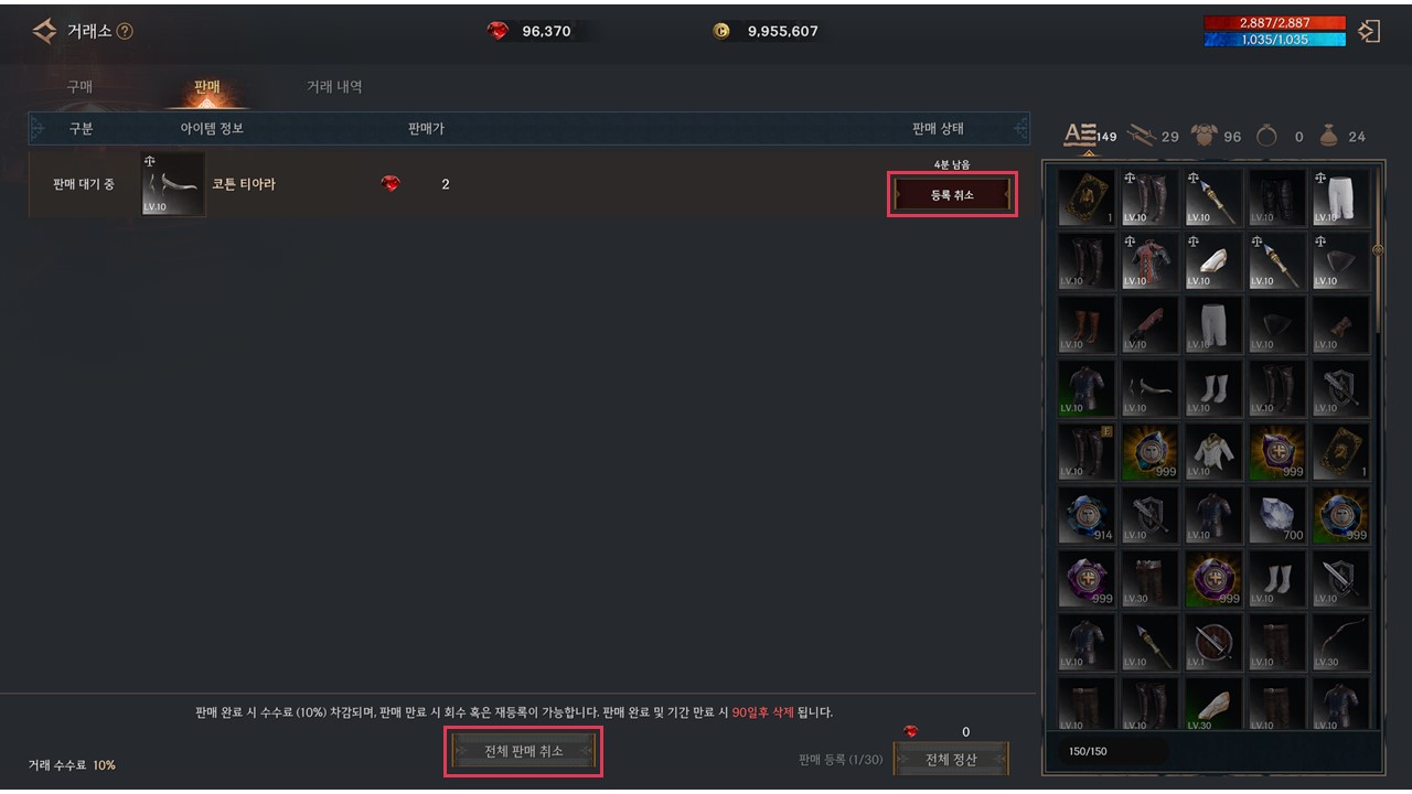 ▹ 거래소 - 판매 화면에서 등록 취소 / 전체 판매 취소 기능을 사용하여 판매 등록한 물품의 등록을 취소할 수 있습니다.