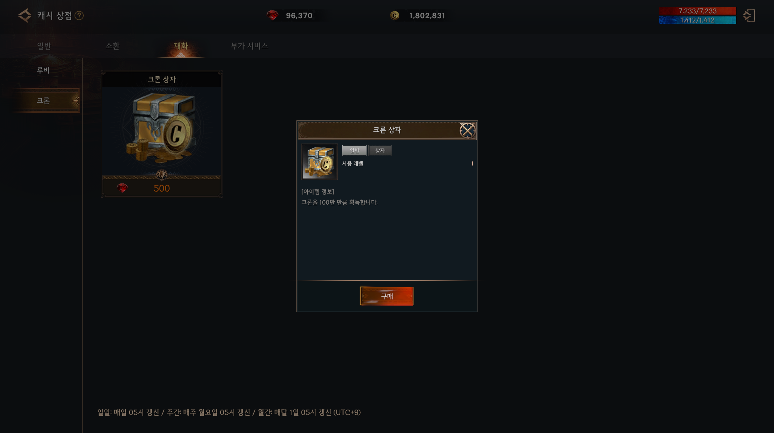 해당 아이템은 크론 부족 상황을 완화하기 위해 마련된 것으로, 크론 거래소에서 구매 가능한 크론이 있는 경우,