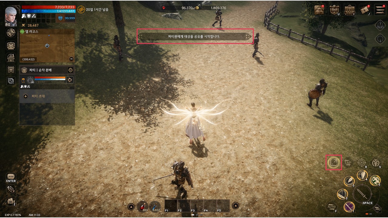 ▹ 메인 화면 우측 하단의 버튼을 클릭/터치하여 파티 타겟을 공유 및 공격할 수 있습니다.