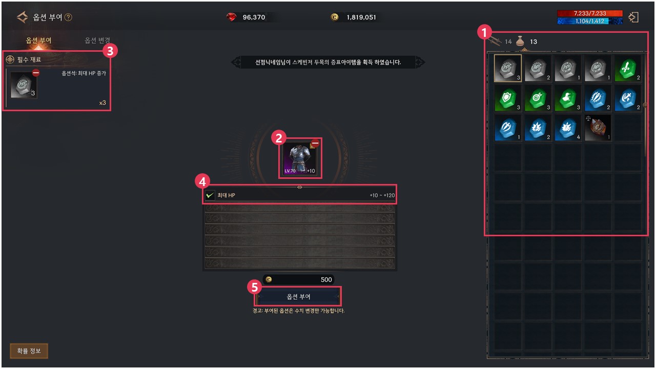 - 옵션 부여 - 옵션 변경 탭에서 크론을 지불하여 장비에 옵션을 부여할 수 있습니다.