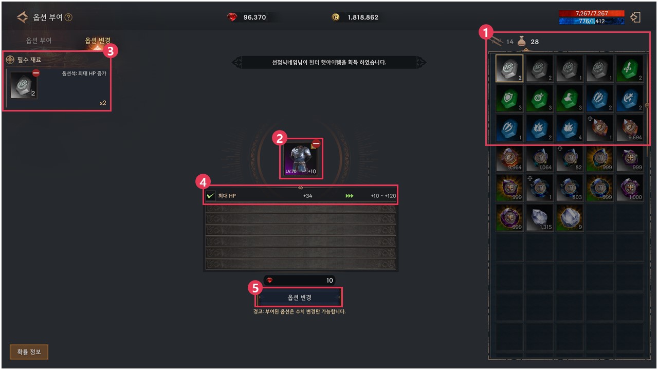 - 옵션 부여 - 옵션 변경 탭에서 루비를 지불하여 장비에 부여된 옵션의 수치를 변경할 수 있습니다.