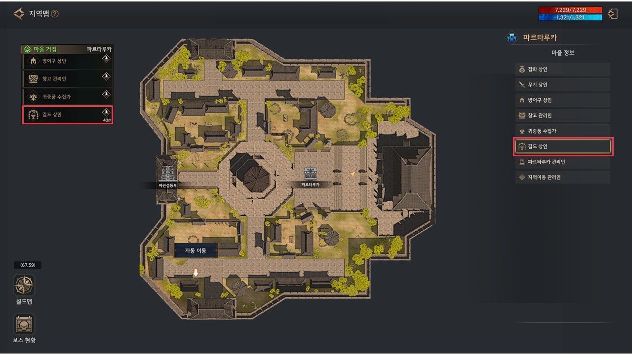 > 지역맵의 마을 정보 / 메인 화면 좌측 상단 마을 거점 메뉴를 사용해 쉽게 길드 상점을 찾을 수 있습니다.