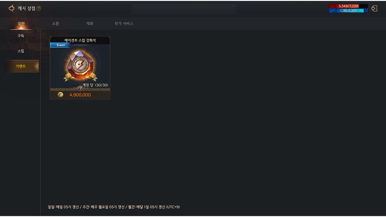| 에이션트 스킬 강화석 | 에이션트 스킬 강화석 | 1 | 4,900,000 크론 | 계정 당 30회 |
