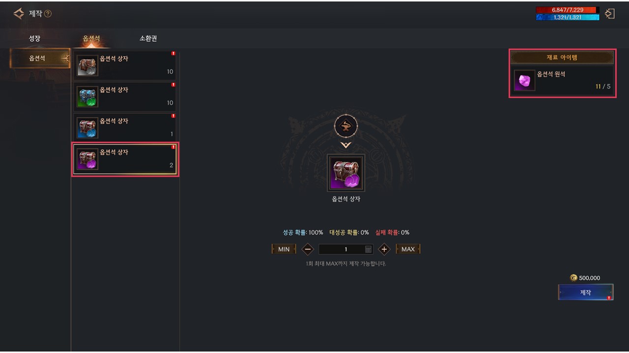 ▹ 고대 옵션석 원석을 재료로 사용하여 고대 등급 옵션석 상자를 제작할 수 있습니다.