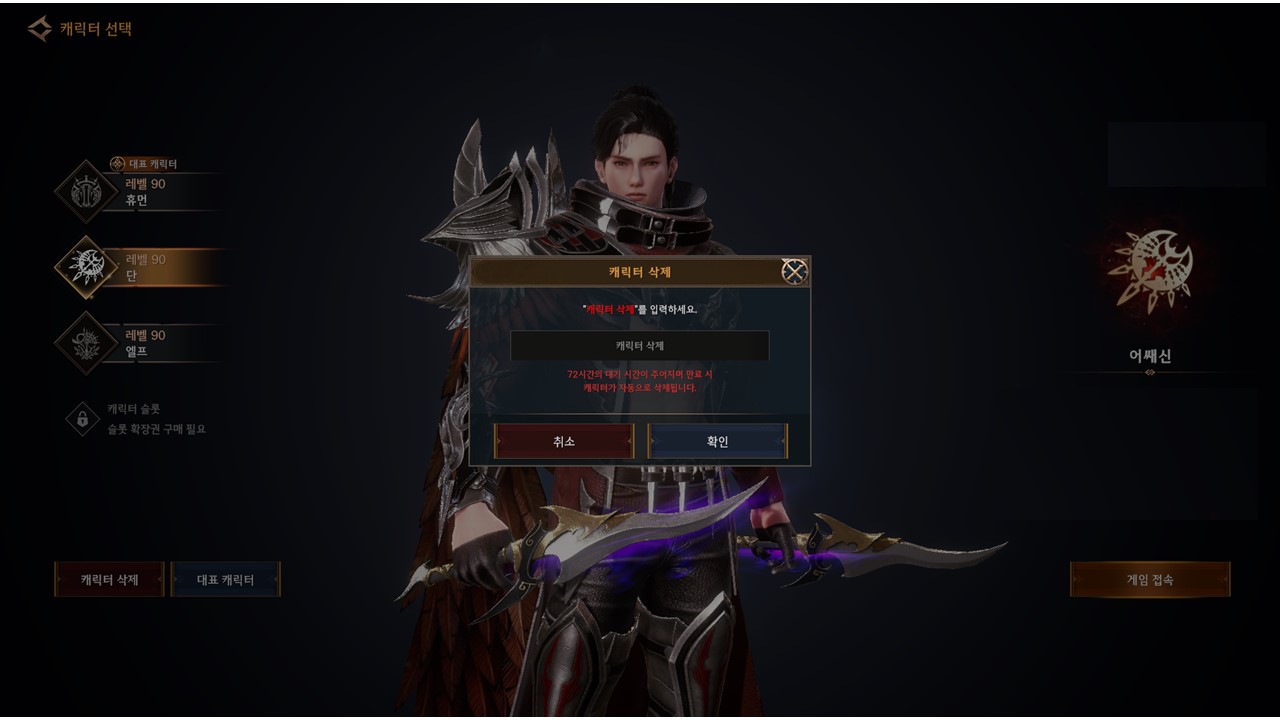 ▹ 캐릭터 삭제 진행 시 캐릭터는 72시간의 삭제 대기 시간을 가집니다.