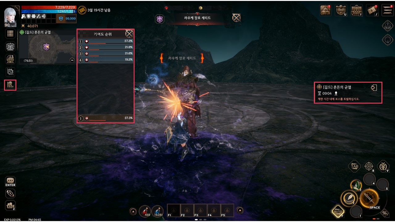 > 메인 화면에서 참여 길드원의 기여도 순위와 남은 제한 시간을 확인할 수 있습니다.