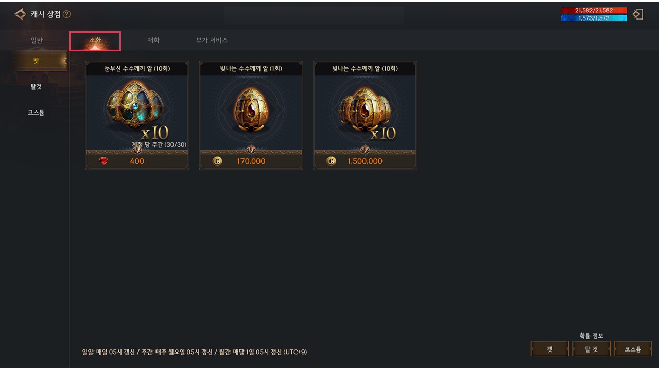 눈부신 수수께끼 알 (10회) | 펫 | 눈부신 수수께끼 알 (10회) | 1 | 400 루비 | 계정당 주 30회 |