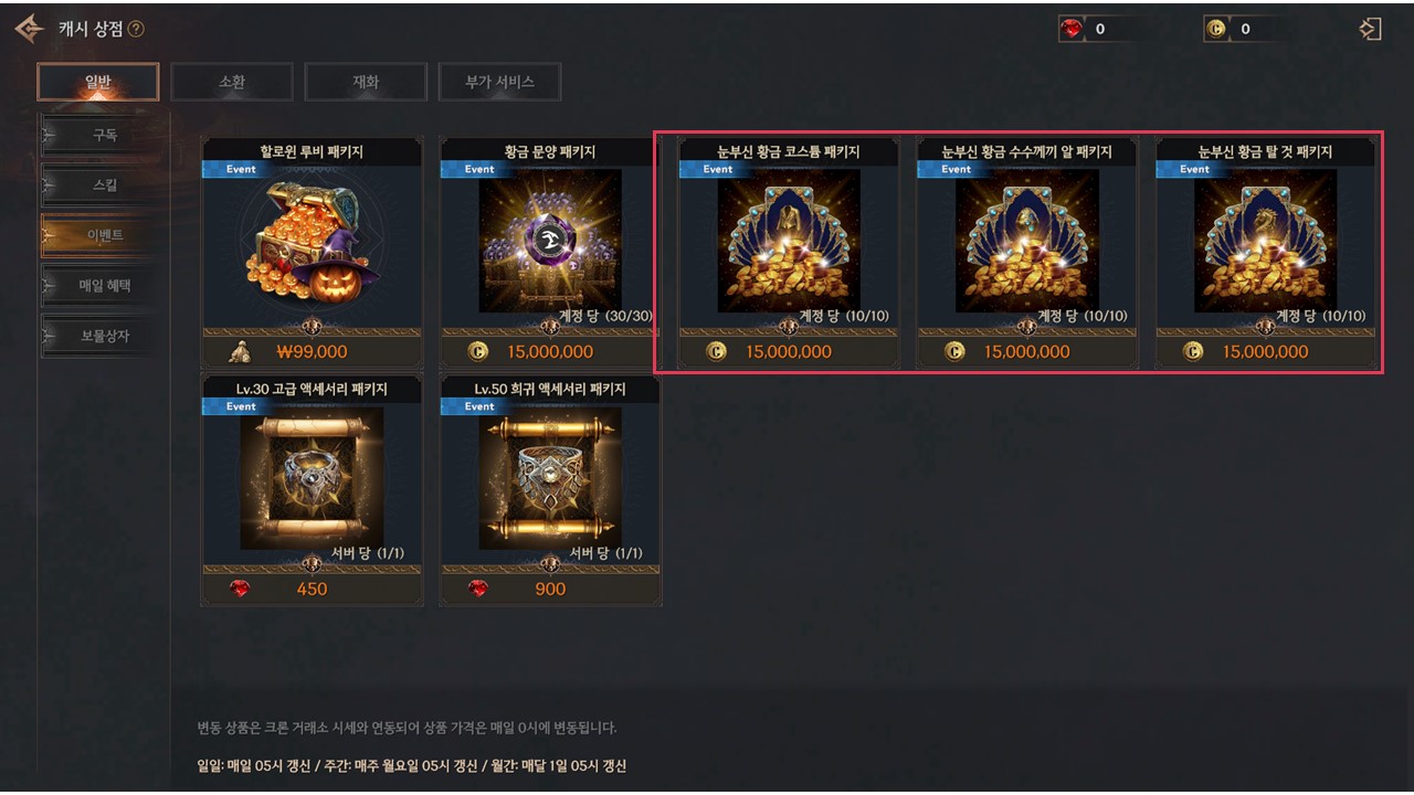 | 눈부신 황금 탈 것 패키지 | 눈부신 탈 것 소환권 (10회) | 1 | 1500만 크론 | 계정당 10회 |