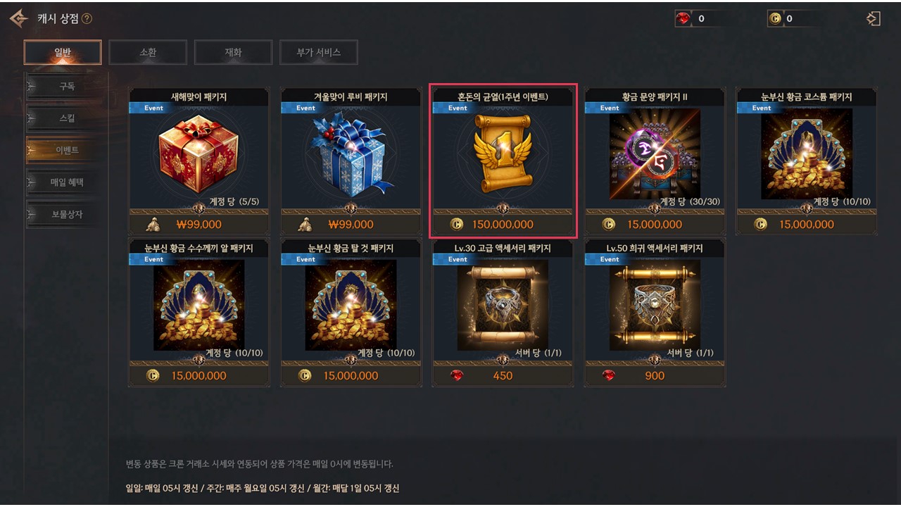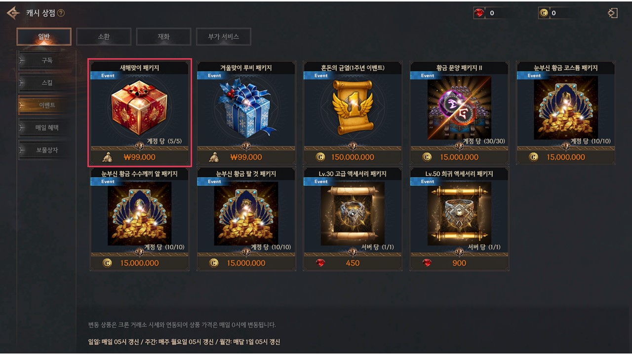 | 새해맞이 패키지 | 4500 루비 상자 | 1 | 99,000원 | 계정당 5회 |
