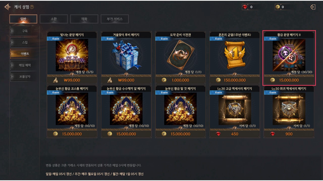 | 황금 문양 패키지 II | 혼돈의 문양강화석 상자 | 50 | 1500만 크론 | 계정당 30회 |