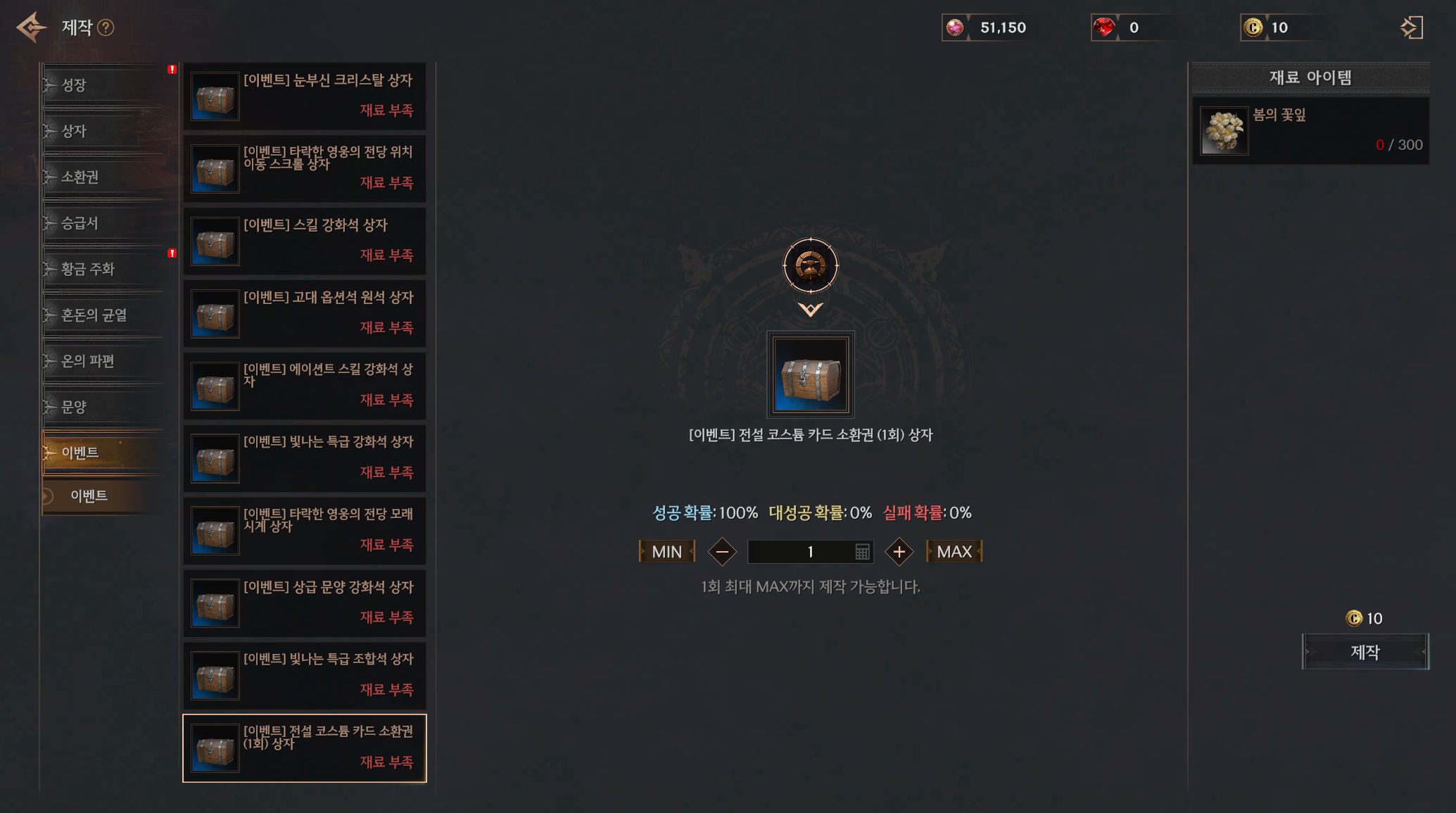 | 스킬 강화석 | 300 | 봄의 꽃잎 | 3 | 10크론 | 100% |