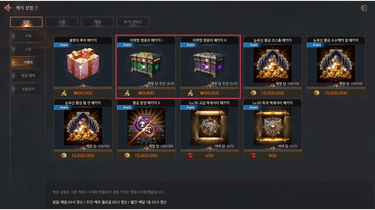 | 타락한 영웅의 패키지 II | 타락한 영웅의 전당 모래시계 | 10 | 99,000원 | 계정당 주간 2회 |