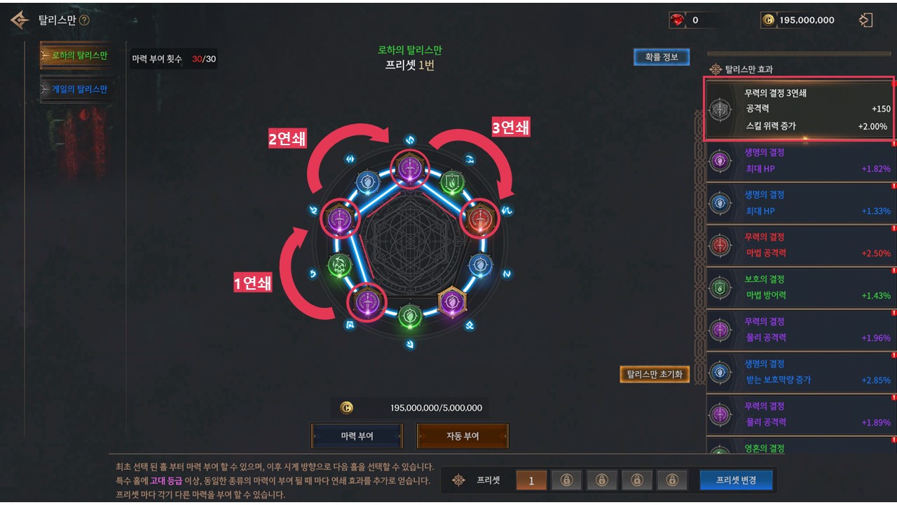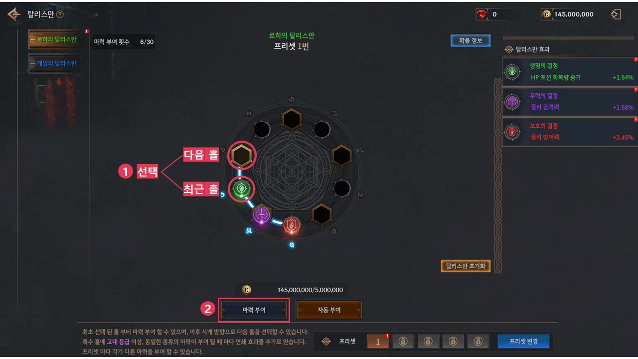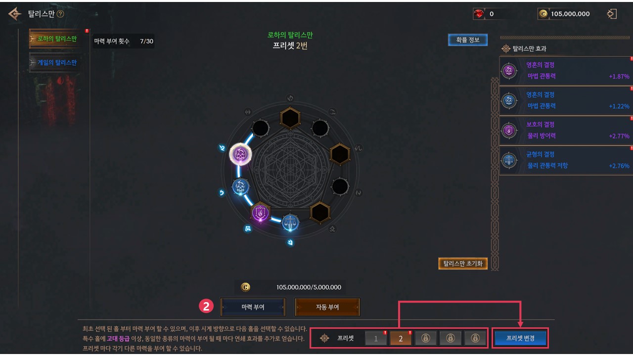 탈리스만은 각 홀에 마력을 부여하여 능력치를 획득하는 성장 콘텐츠입니다.