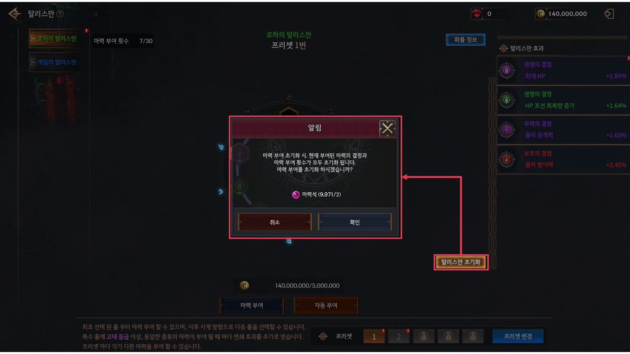 ▹초기화에는 마력석이 2개 소모됩니다.