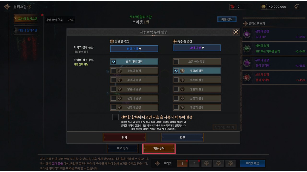 ▸ 자동 부여 기능으로 설정한 옵션이 부여될 때까지 자동으로 마력 부여를 시도할 수 있습니다.