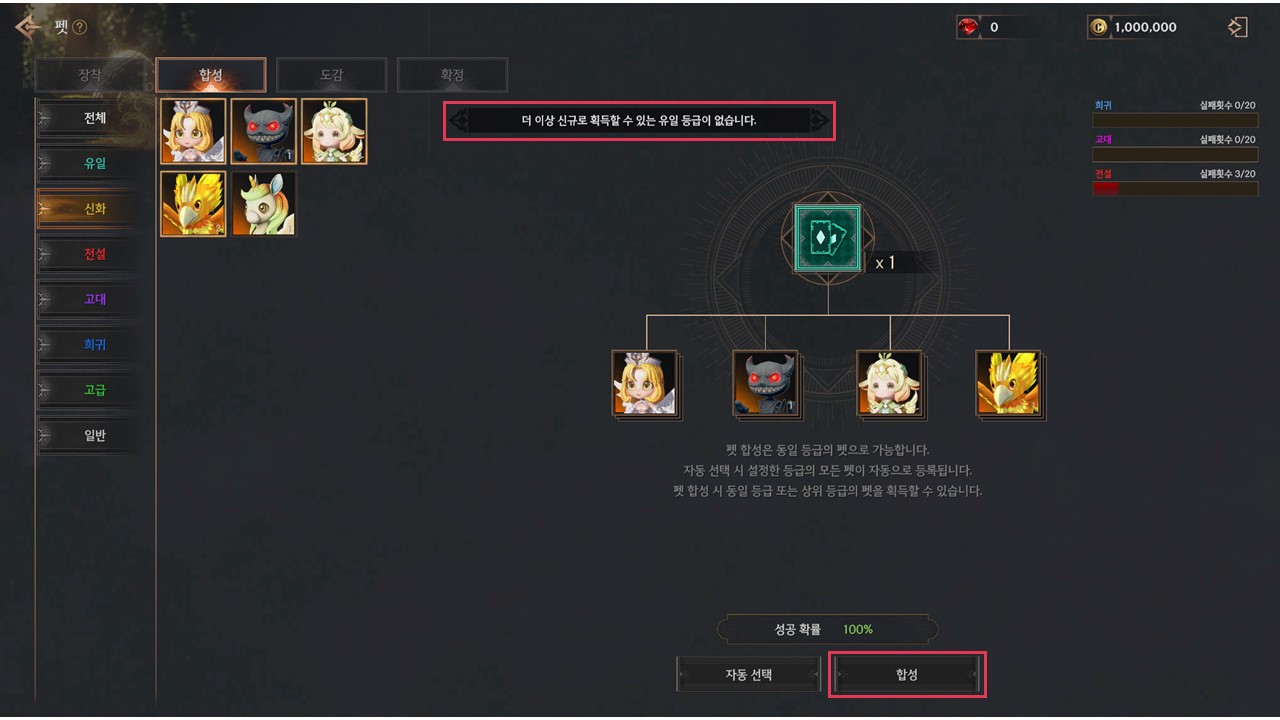 ✧ 이미 유일 등급 펫, 탈 것, 코스튬을 보유하였다면 신화 4개를 재료로 유일 등급을 추가 합성 시도할 수 없습니다.