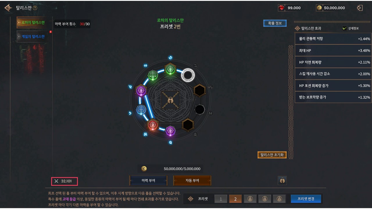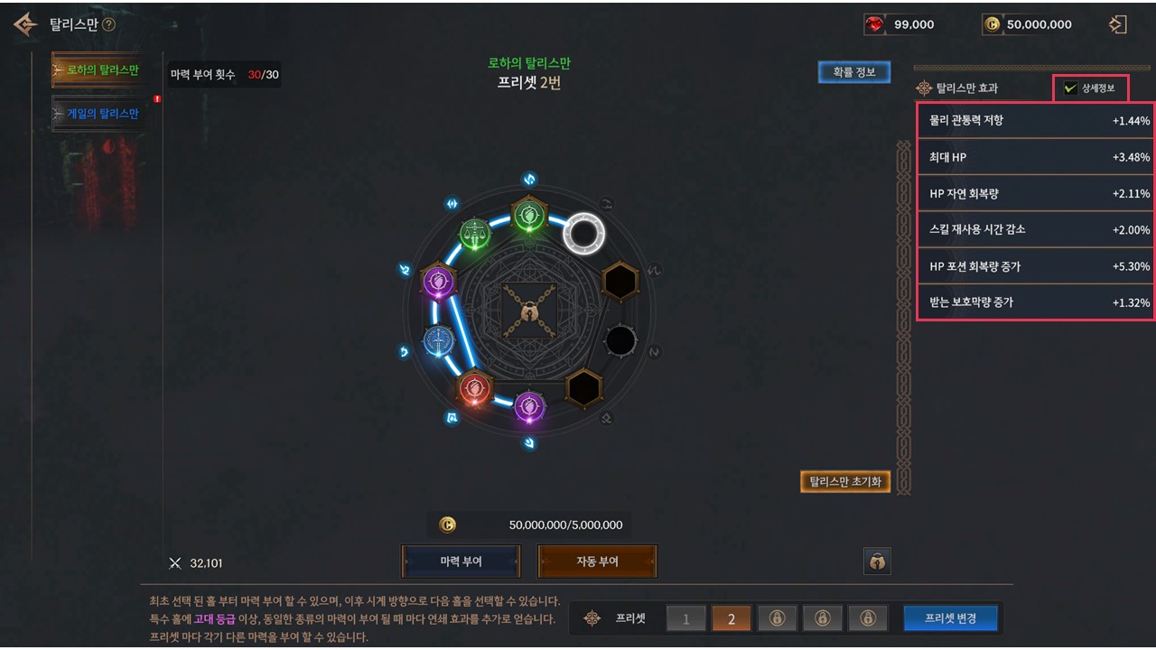 ✧ 탈리스만 효과 우측의 [□상세정보]를 체크하여 모든 마력부여 옵션의 합산 수치를 확인할 수 있습니다.