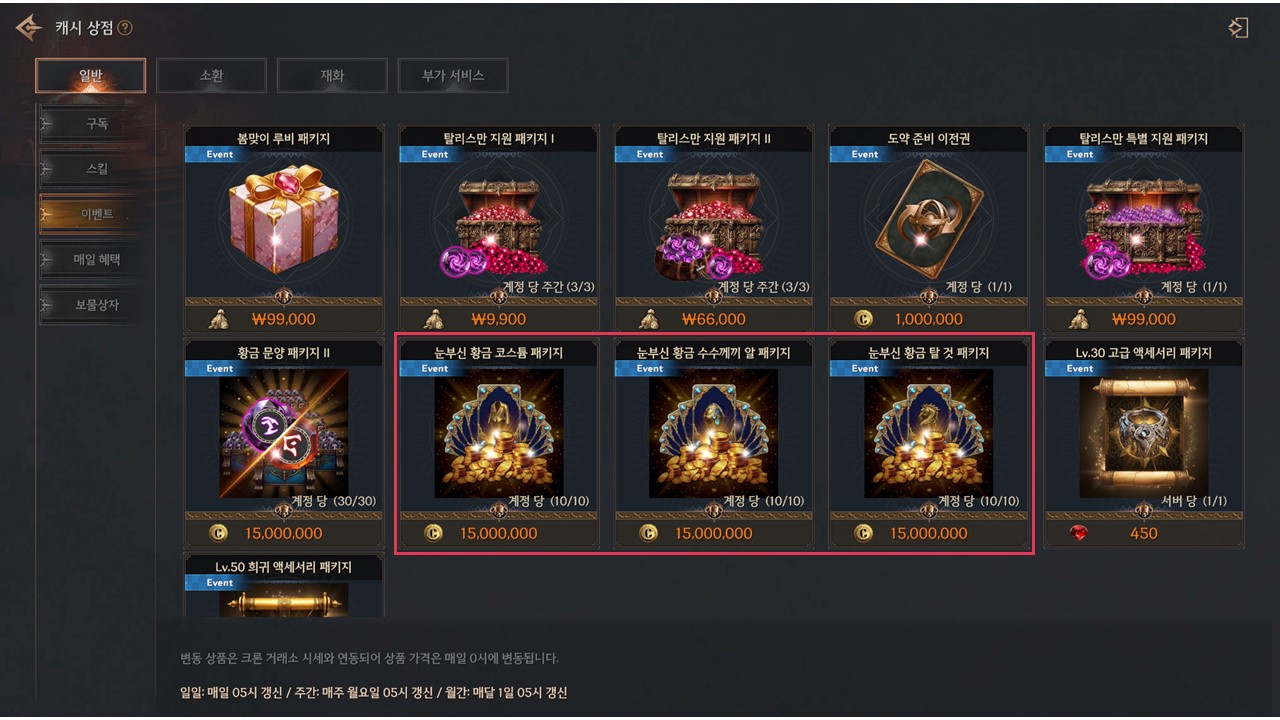 | 눈부신 황금 탈 것 패키지 | 눈부신 탈 것 소환권 (10회) | 1 | 1500만 크론 | 계정당 10회 |