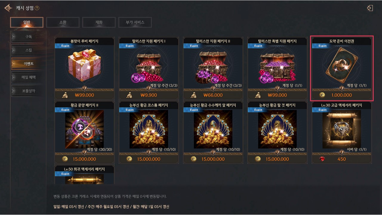 ▸서버 이전 기간 중 계정 당 1회 크론으로 구매 가능한 서버 이전권인 ‘도약 준비 이전권’ 구매가 가능합니다.