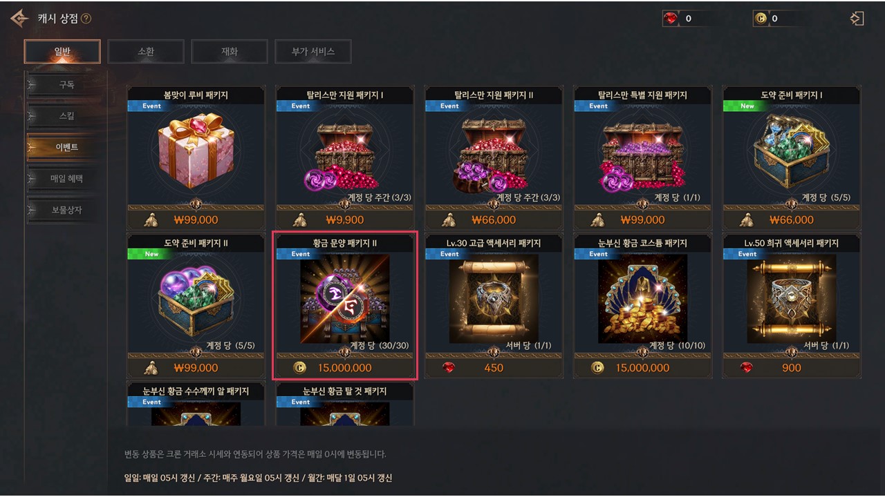 | 도약 준비 패키지 Ⅱ | 마력석 | 60 | ₩99,000 | 계정당 5회 |