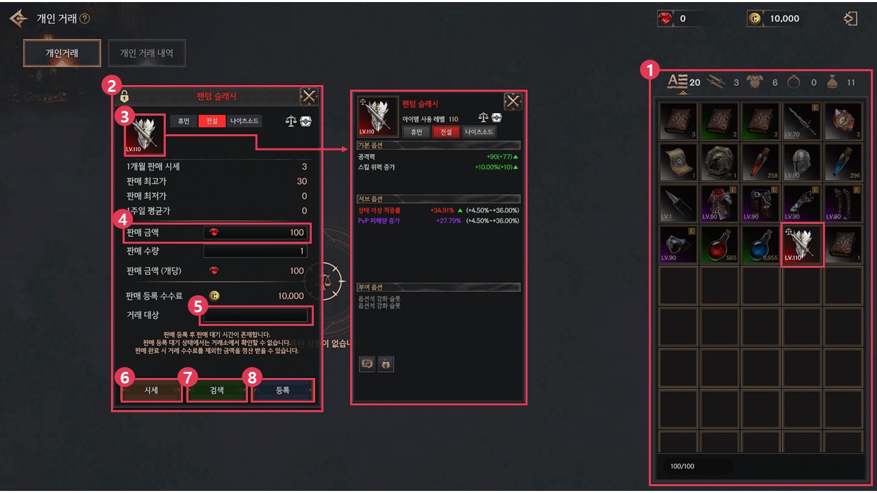 ① 판매 등록할 아이템을 선택할 수 있습니다. 거래 가능한 아이템만 판매 등록할 수 있습니다.