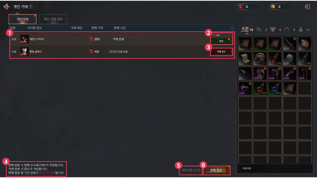 ③ 아직 상대가 구매하지 않은 아이템을 거래 취소할 수 있습니다.