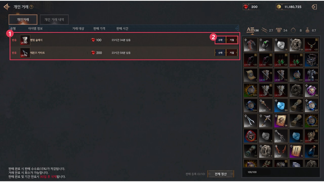 ▹ 본인 앞으로 판매 등록된 아이템은 유형에 ‘받음’으로 표시됩니다.