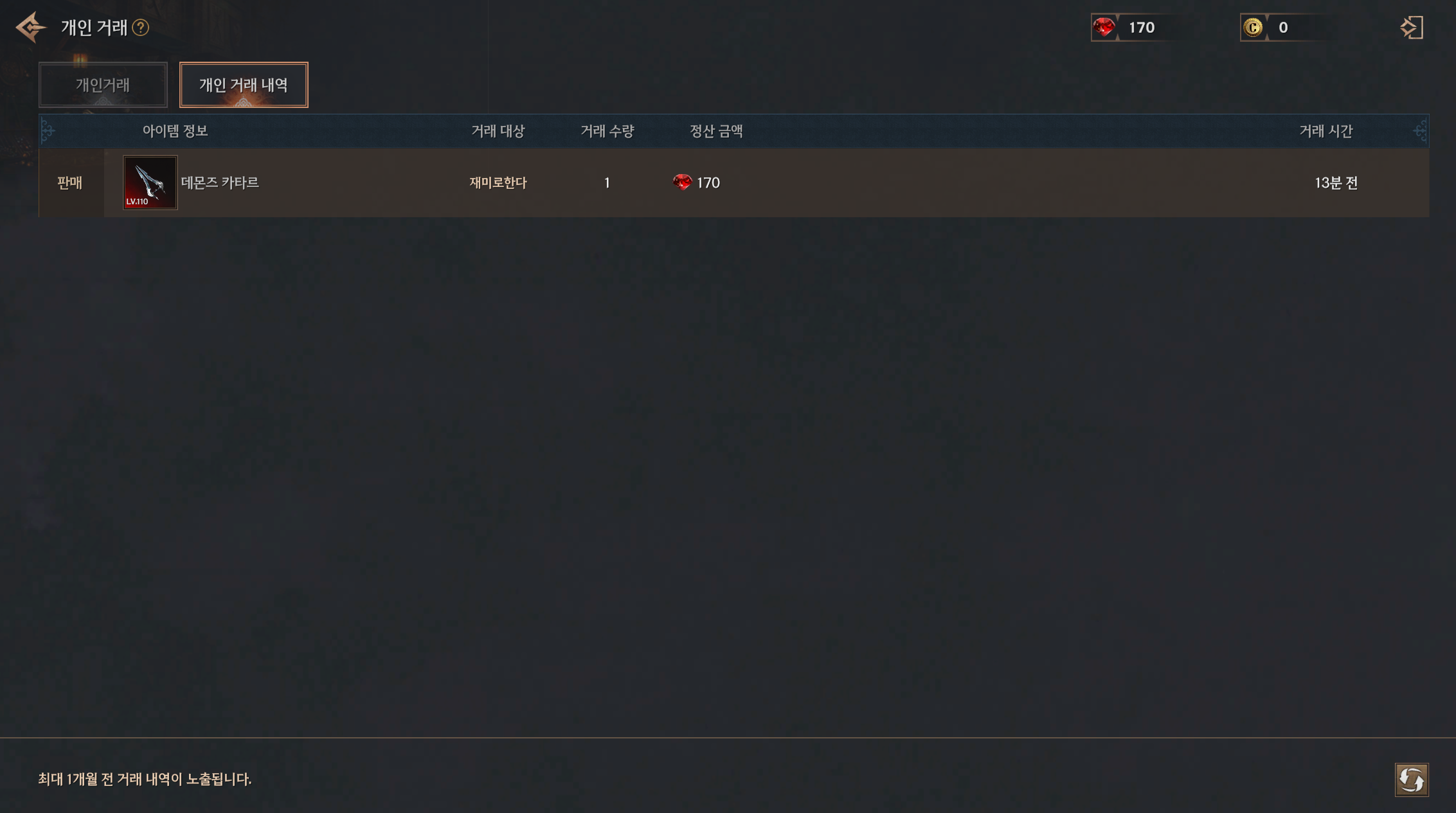 개인 거래 내역 탭에서 최대 1개월 간의 개인 거래 내역을 확인할 수 있습니다.
