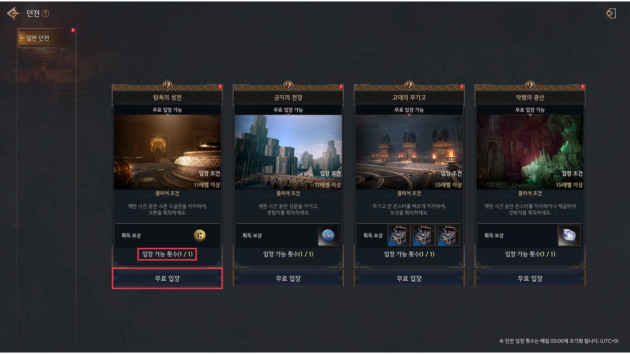 > 입장 가능 횟수는 매일 오전 05:00 기준으로 초기화됩니다.