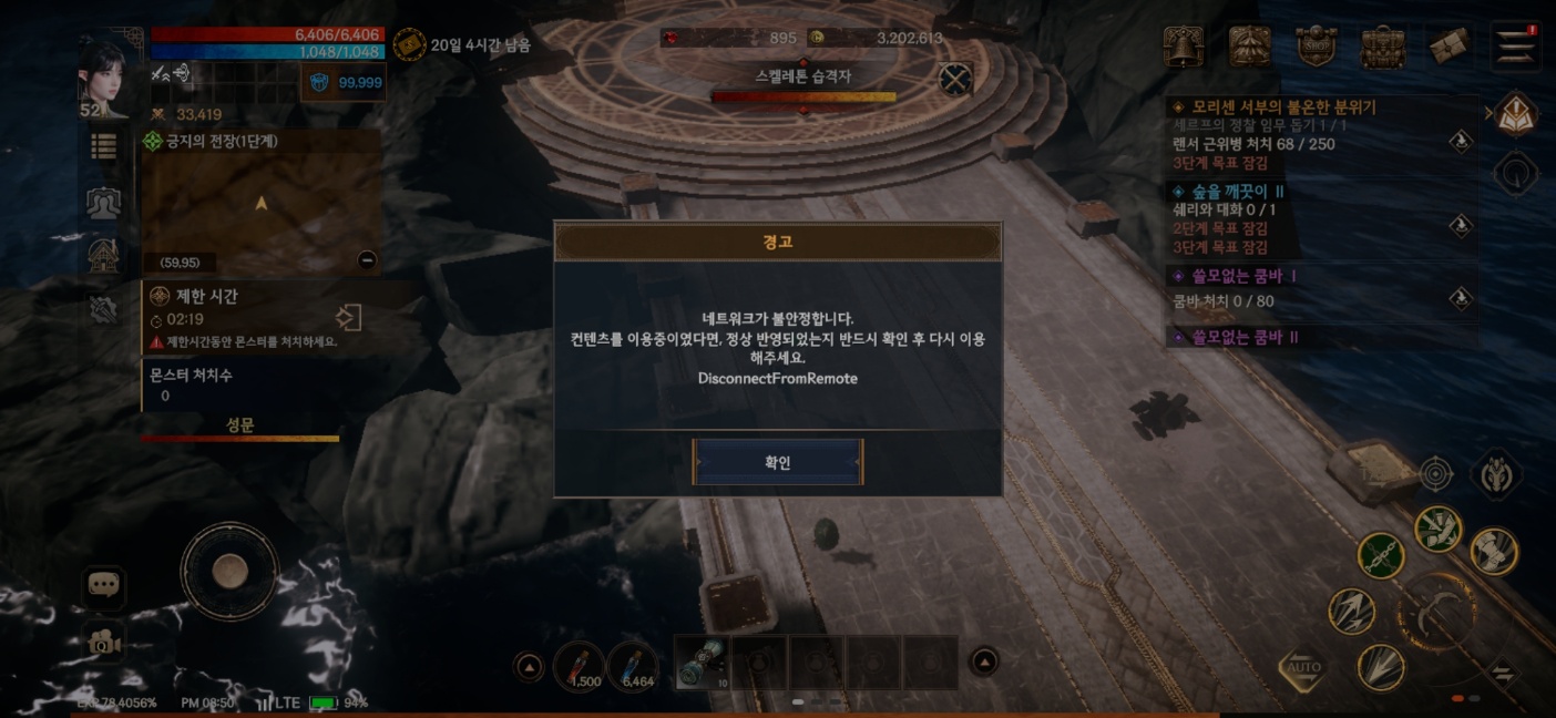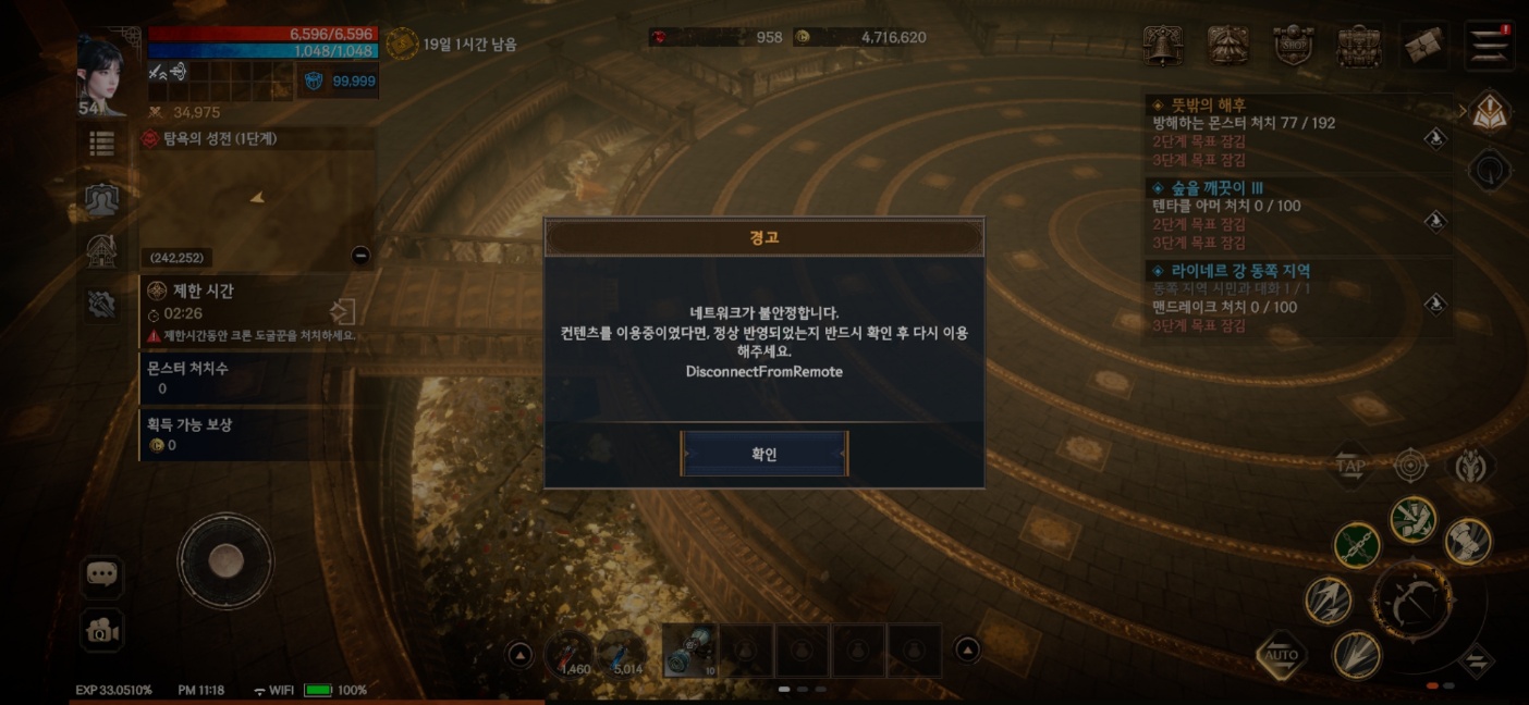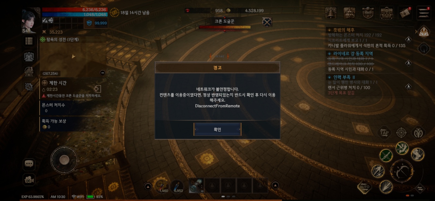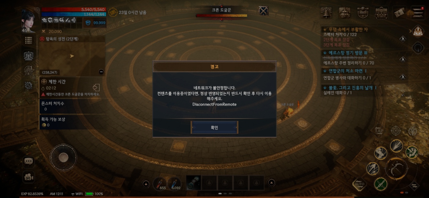 그나마 경험치던전(긍지의 전장)도 자주 팅기긴 하는데 크론던전(탐욕의성전)보단 좀 덜팅기네요